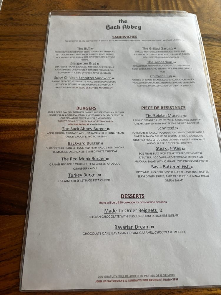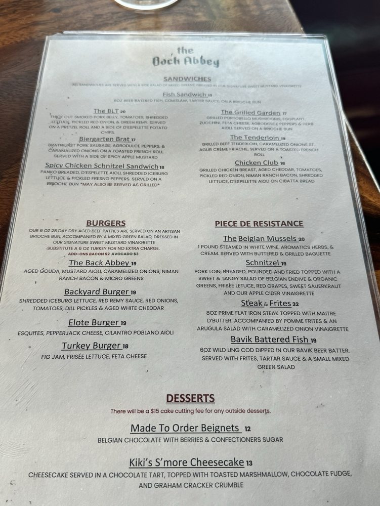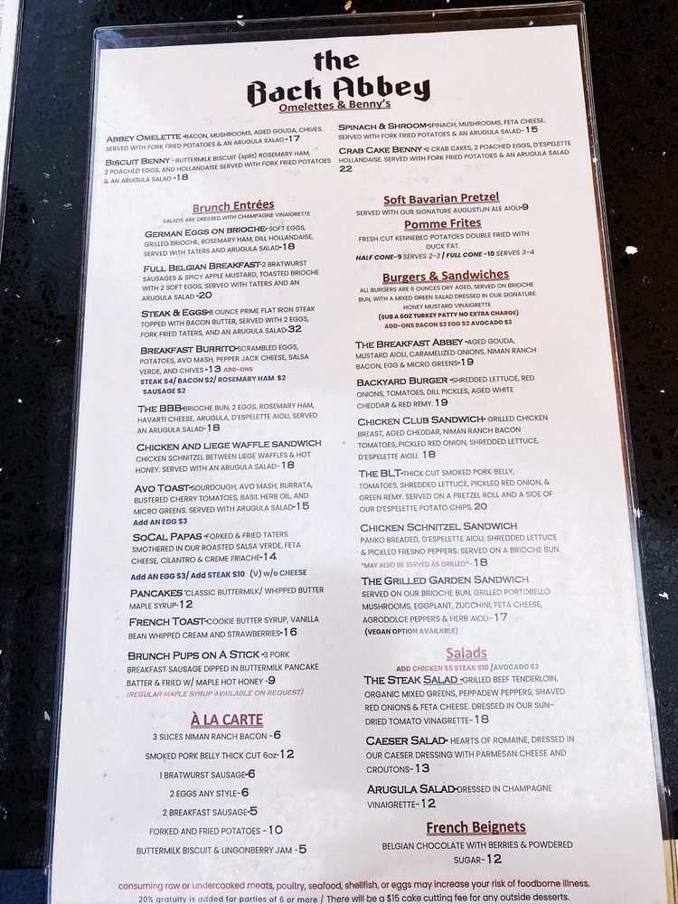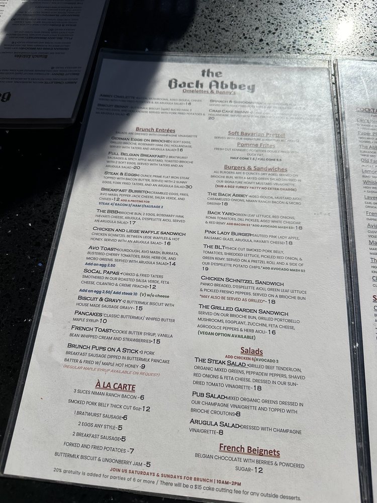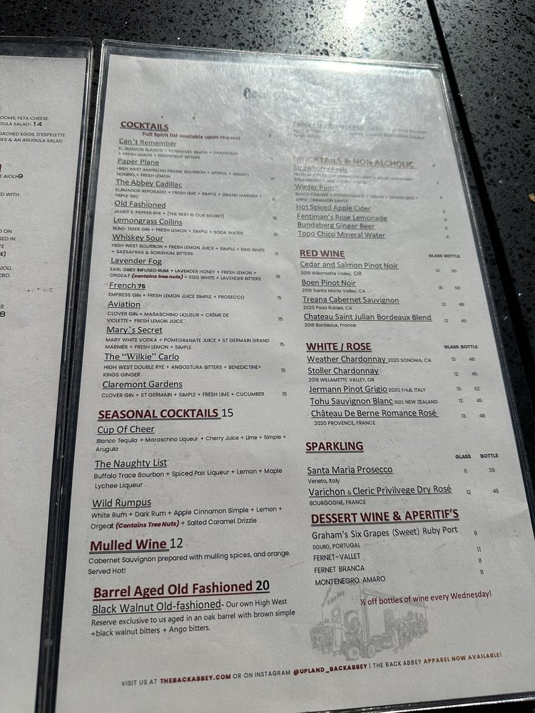 The Back Abbey in Upland is a gastropub that offers a diverse menu of burgers and sandwiches. They take reservations, offer takeout and delivery, and provide options for vegans and limited options for vegetarians. The restaurant is wheelchair accessible with accessible parking near the entrance. They accept Apple Pay and Credit Cards and have outdoor seating with moderate noise levels, making it a great spot for groups to enjoy dinner. The Back Abbey also offers waiter service, happy hour specials, a full bar, and allows dogs on the premises. With gender-neutral restrooms, catering services, Wi-Fi, and drive-thru options, The Back Abbey caters to a wide range of customers. Additionally, they prioritize sustainability by using compostable containers and plastic-free packaging. The atmosphere is relaxed and inviting, creating a pleasant dining experience for all.